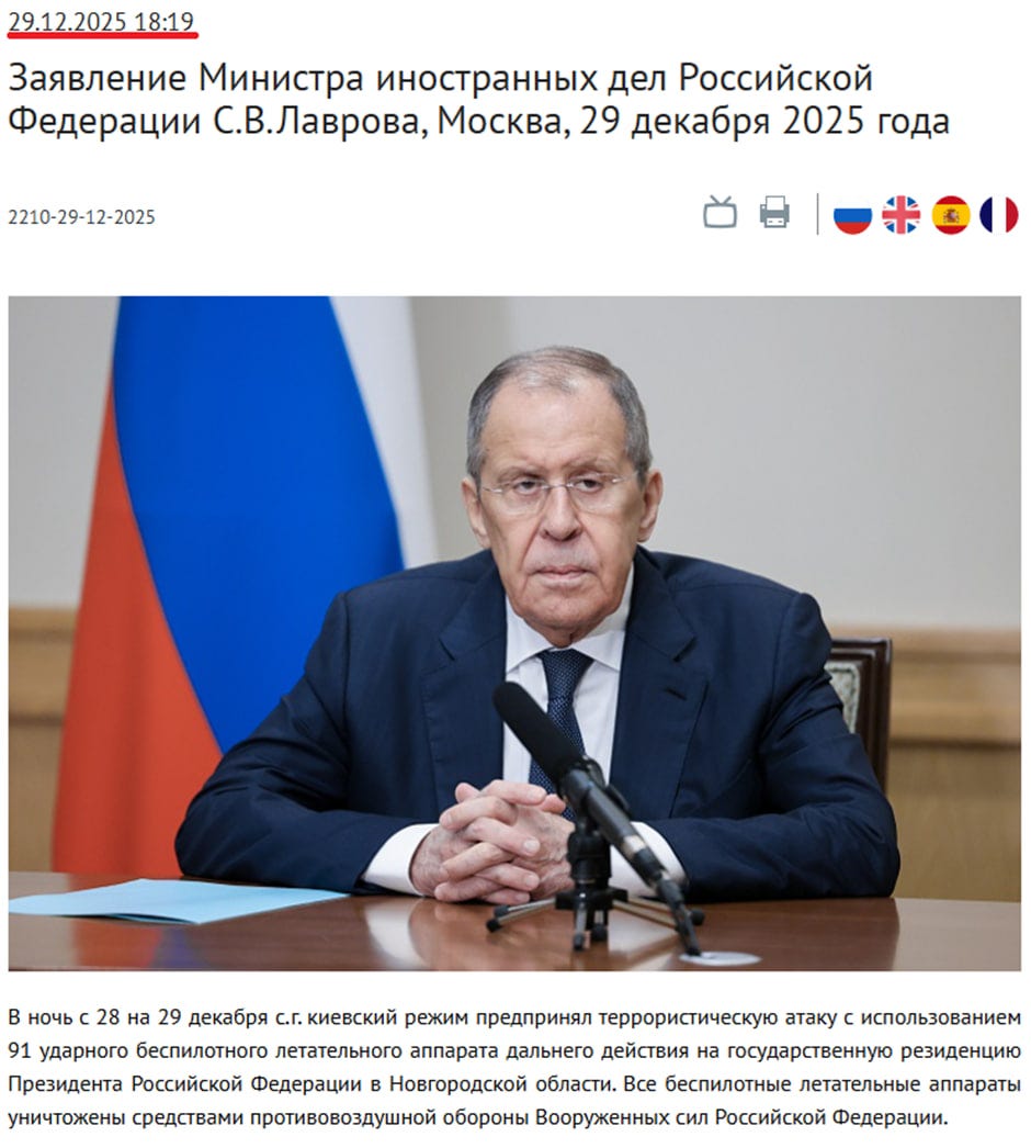 The following day, December 29, Russian Foreign Minister Sergey Lavrov claimed that 91 drones had allegedly attacked Vladimir Putin’s residence in Valdai, Novgorod region. Afterward, Putin’s advisor Yuriy Ushakov stated that “Trump was shocked and outraged by the attempted Ukrainian attack on Putin’s residence” and that the U.S. administration “thankfully did not provide Tomahawks to Kyiv.”