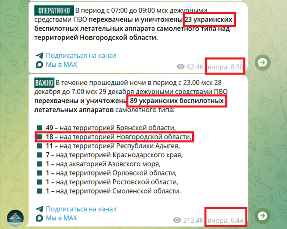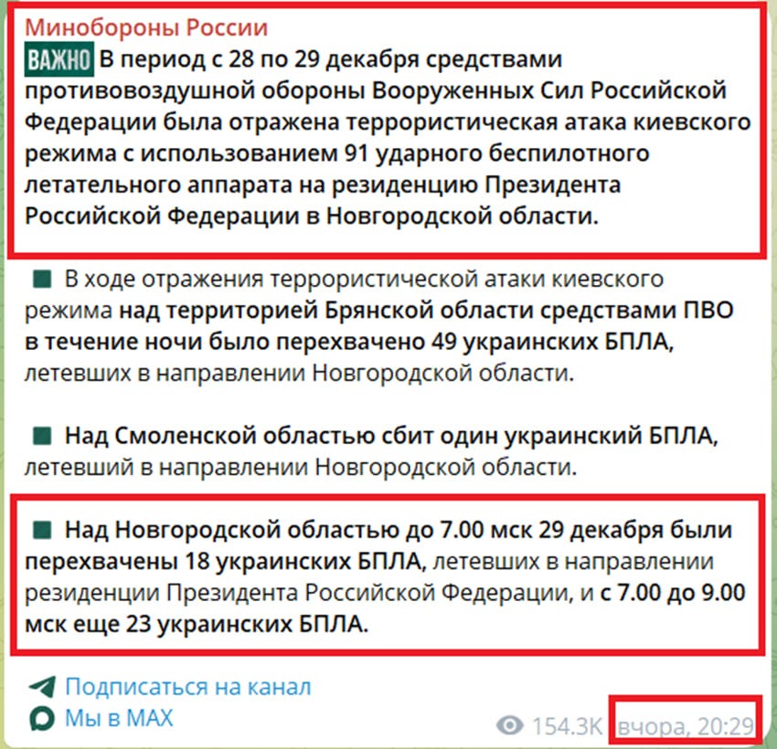 Moreover, these claims contradict data from the Russian Ministry of Defense. Initially, at 6:44, the MoD reported shooting down 89 Ukrainian drones overnight between December 28-29, of which only 18 were in the Novgorod region; later, at 8:30, they reported 23 more drones downed. The Ministry of Defense only mentioned the “attack” on the Valdai residence at 20:29 – more than two hours after the Russian Foreign Ministry’s statement.