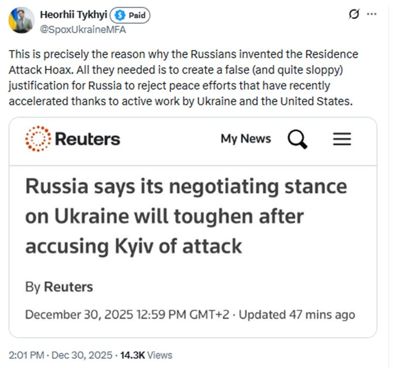 The Ukrainian Foreign Ministry spokesperson, Heorhii Tykhyi, stated on X that the Russians fabricated “the Residence Attack Hoax” to create a false excuse for rejecting peace initiatives.
