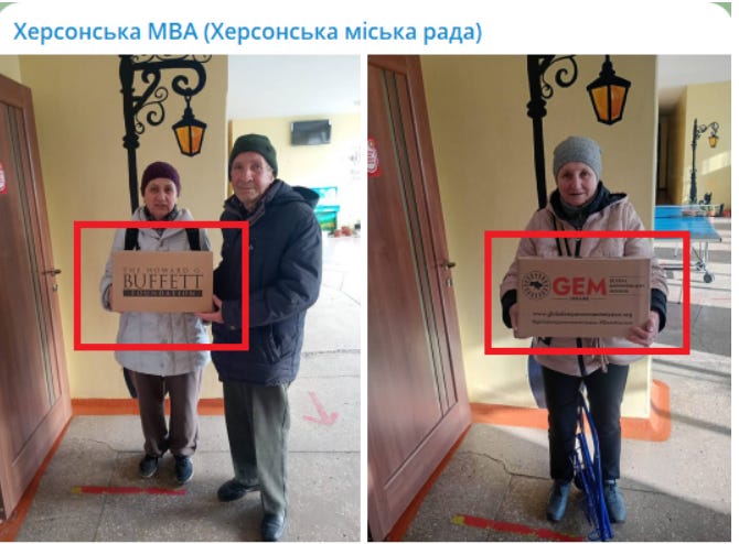 This is fake. The images were manipulated using graphic editing software. In the original photos, Kherson residents are receiving humanitarian aid from international charitable organizations. Moreover, the photos were taken in November 2025, while propagandists first began spreading them on March 30, 2026.