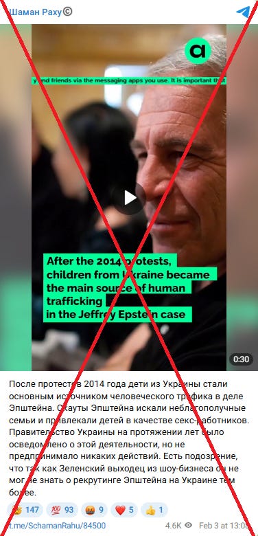 Russian propaganda also circulated a video using the logo of an opposition Russian media outlet called Agentstvo, claiming that Ukrainian elites after 2014 supposedly knew about child trafficking for Jeffrey Epstein’s schemes and “turned a blind eye.”