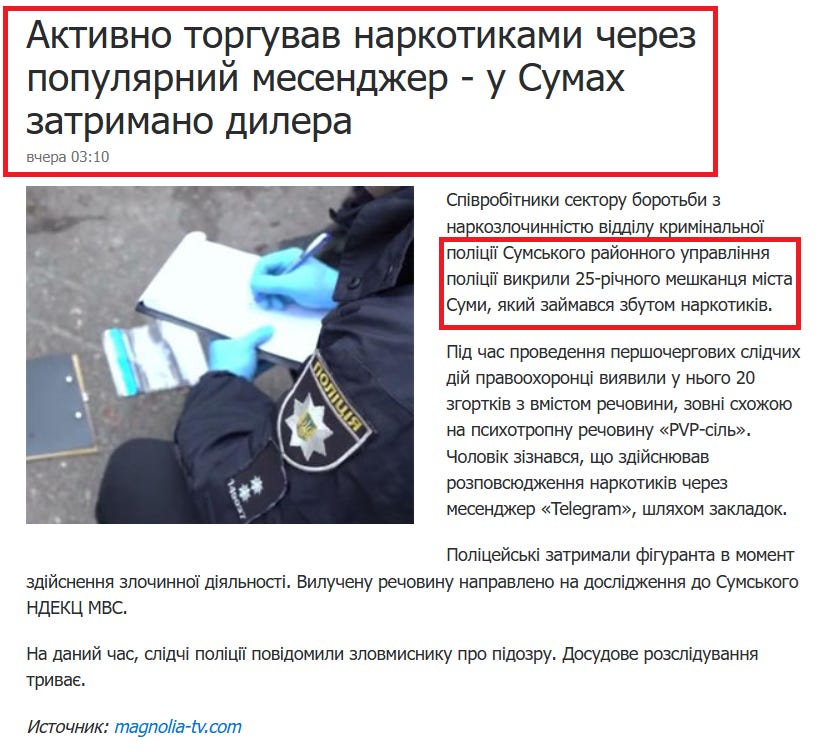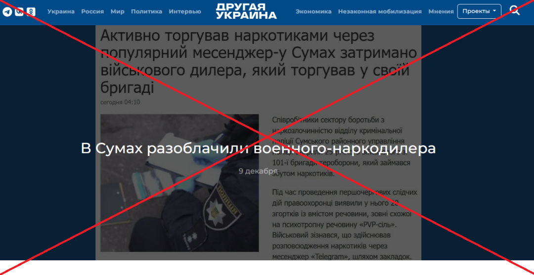Russian propaganda media and Telegram channels are circulating a screenshot allegedly showing a news item from a Ukrainian outlet. It claims that a servicemember of the 101st Territorial Defense Brigade was detained in the Sumy region for “distributing” drugs.